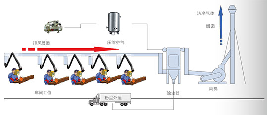 車間產(chǎn)生的煙塵由捕集裝置瞬間捕集收集后,經(jīng)采用漸變管徑式(目的是平衡管路末端風(fēng)速風(fēng)量)的主管道進(jìn)入除塵器,煙塵在除塵器內(nèi)被高效凈化濾件阻截凈化,顆粒物在風(fēng)機(jī)負(fù)壓作用下附著在濾件外側(cè),脈沖閥在控制儀的控制下,每隔一定時間,自動對系統(tǒng)濾件由里至外進(jìn)行反吹清灰,反吹過程中顆粒物落入灰斗內(nèi)收集,灰斗內(nèi)積累到一定量的顆粒物后,需要外運處理。在風(fēng)機(jī)的作用下。凈化后的達(dá)標(biāo)氣體由煙囪排出。